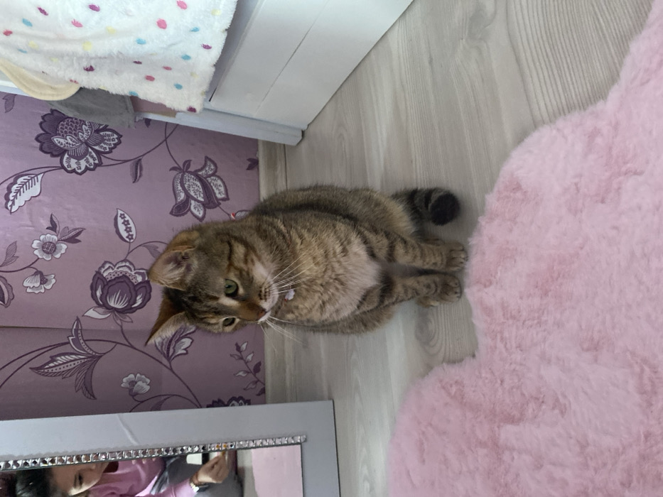 A domestic short-haired tabby cat, predominantly brown with darker stripes and a white chest, sits on a light-colored wooden floor. The cat wears a small white collar and looks towards the left with a neutral expression. Adjacent to the cat's front, a pink, heart-shaped, faux fur rug is partially visible on the floor. In the background, a wall is covered with lavender-purple wallpaper featuring a repetitive floral and vine pattern. To the left, a portion of a grey-framed mirror, adorned with small reflective embellishments along its inner edge, reflects a female individual. This individual, wearing a pink top and dark pants, is seen kneeling on the floor, facing downwards and appearing to handle a small object off-frame to the left. To the right, a white piece of furniture, possibly a bed frame or dresser, is partially visible, with a white blanket featuring multicolored polka dots draped over it. The scene is located within a room in Varna, Bulgaria.