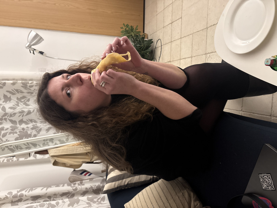 - "A woman with curly brown hair is eating a yellow snack" by FM-sjPR52, licensed under CC BY 4.0