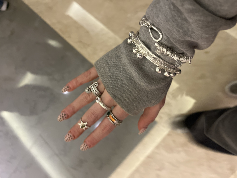 A close-up, downward-angled view depicts an individual's left hand and wrist, located within an indoor setting in Wulingyuan, China. The person wears a grey long-sleeved garment, likely a sweatshirt. The fingernails are manicured with a light translucent base and small, dark, irregular polka dots. Four silver-colored rings are present on the fingers: a ring with a white, star-like or floral element on the ring finger, a textured, possibly snake-like band on the middle finger, a multi-layered or stylized 'T' shaped ring on the index finger, and a band containing small, rectangular orange or amber stones on the pinky finger. On the wrist, two silver-colored bracelets are worn over the sleeve: one is a wide cuff-style bracelet with prominent spherical beads along its top edge and intricate patterns, and the other, partially visible, appears to be a segmented or coiled design with a visible hook-and-eye clasp. A blurry dark pant leg and shoe are visible at the bottom left, indicating the individual is standing or moving. The environment features a smooth, reflective floor composed of a darker grey section on the left and a lighter beige or cream-colored section on the right, with reflections of overhead lighting.