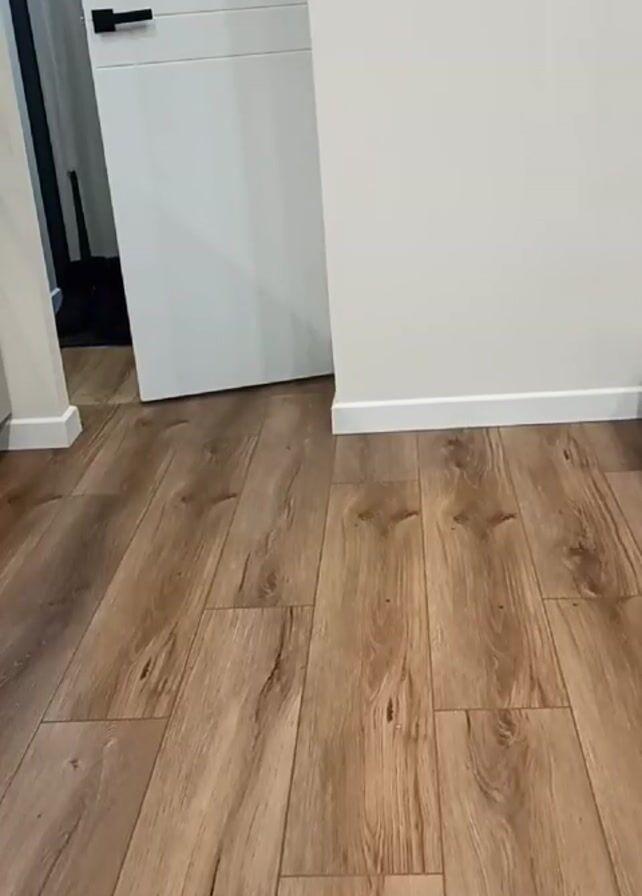 hardwood floor in a room with white walls and a white door slightly ajar. The door has a black handle. The floor is made of planks with a light brown wood grain pattern. White baseboards run along the bottom of the walls. A small section of what appears to be a black object is visible inside the doorway. The camera is stationary.