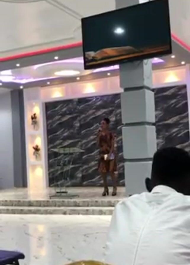 woman singing into a microphone on a raised platform. She is wearing a patterned dress and heels. Behind her is a decorative backdrop with gray and white marble-like patterns, flanked by vertical illuminated white panels with floral decorations. A television screen is mounted on a white column, displaying an image of a book illuminated by moonlight. The flooring is light-colored tile. Seated in the foreground, a man in a white shirt is visible from the back, facing the speaker. The room appears to be a church or auditorium setting.