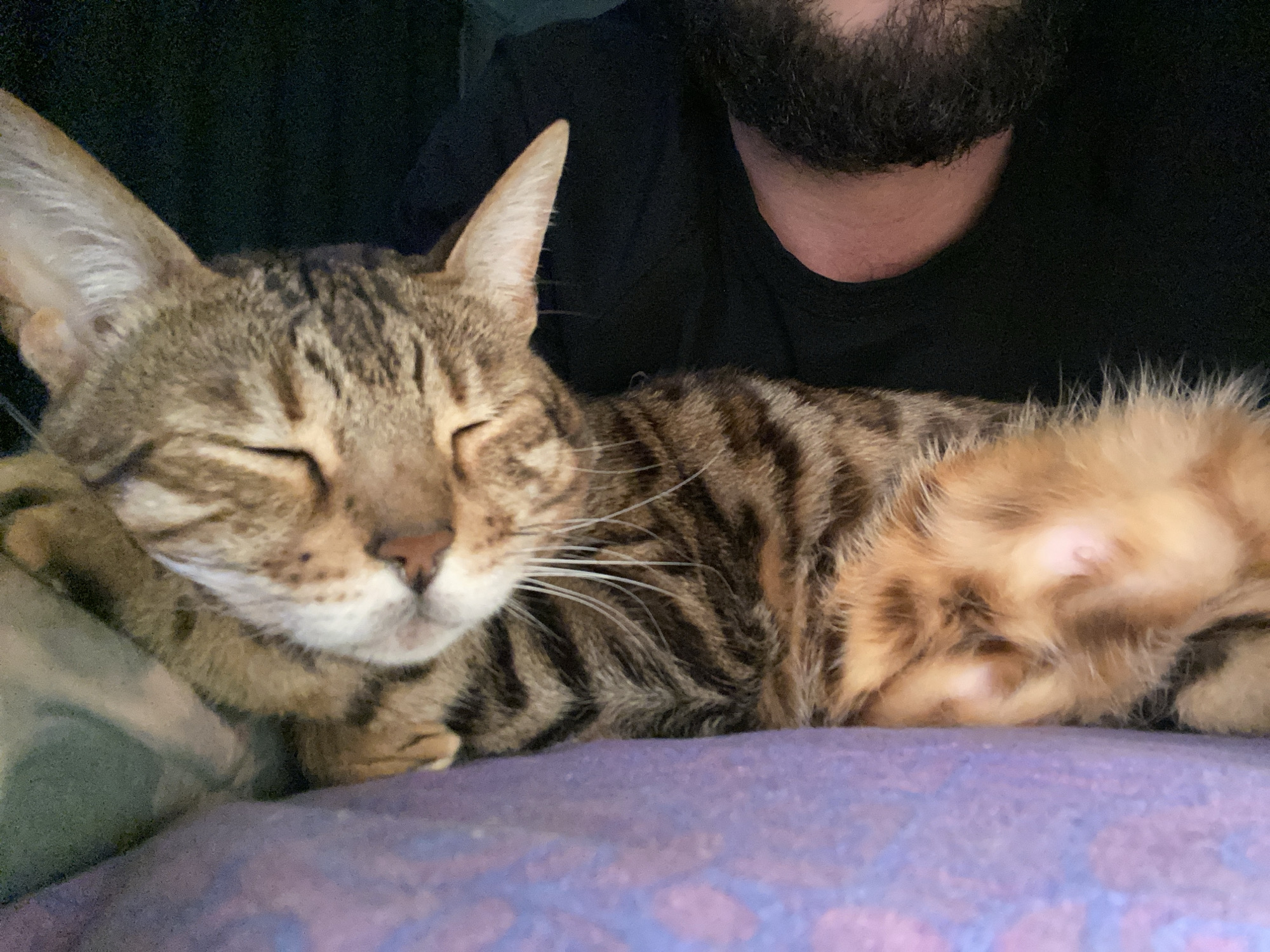 brown tabby cat with its eyes closed, resting its head on a purple and blue patterned surface. A person with a dark beard and a black shirt is partially visible in the background. The location is unknown, and there is no evidence to suggest it is in Chaikovsky, Russia.