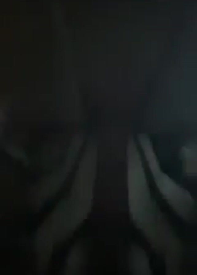 A person wearing a black tactical mask and a black leather jacket appears in the video. The person raises their hand and makes a hand gesture resembling devil horns. The background is a beige-colored wall and a white ceiling.