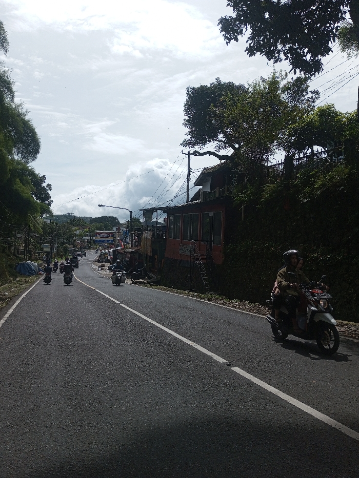 The image depicts a daytime scene on an asphalt road in Sandamal Eliya, Sri Lanka, under an overcast sky with white and grey clouds
