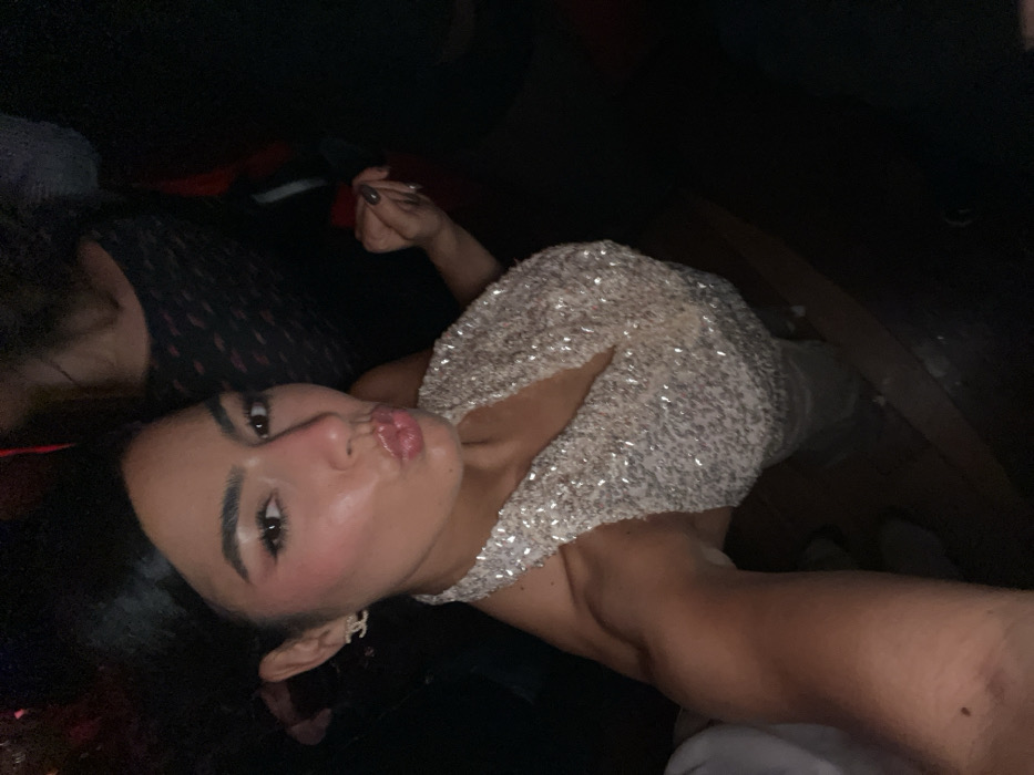 A young adult female is depicted in a dimly lit indoor setting, in the city of Paris, France. She is positioned towards the camera, with her lips puckered in an expression sometimes referred to as a "duck face." Her dark hair is styled upwards, revealing a prominent white Chanel logo earring on her left ear. She wears a light-colored, sequined or beaded halter-neck top or dress. Her right hand, adorned with dark nail polish, is partially raised to the left of her body. Behind her, a second individual is partially visible, wearing a dark, patterned garment. The background is dark and out of focus, with discernible hints of red and other colored artificial lighting, indicative of a nightlife environment.