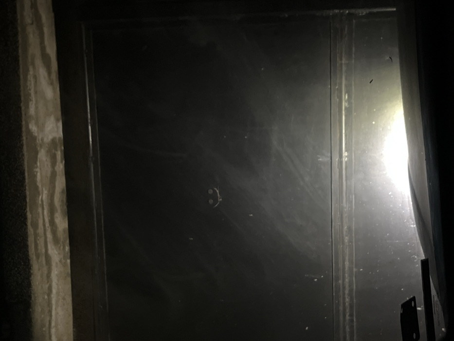 The image depicts a dark scene in Galiche, Bulgaria, observed through a heavily smudged and reflective glass panel, likely a window. The upper section of the frame shows a dark, textured surface, possibly a ceiling or overhang, displaying lighter, irregular patterns. The central area is dominated by the dark, reflective glass, exhibiting numerous streaks and smudges. A small, crudely drawn or etched smiley face is visible on the upper-left quadrant of this glass, composed of two dots for eyes and an upward-curving line for a mouth, with two small vertical lines at its extremities. The lower portion of the glass panel features a distinct, bright reflection from an external light source, indicating night conditions and suggesting the perspective is from a dark interior space or vehicle. A dark, angled structure, consistent with an interior vehicle component, is partially visible at the bottom edge. No individuals are directly present.