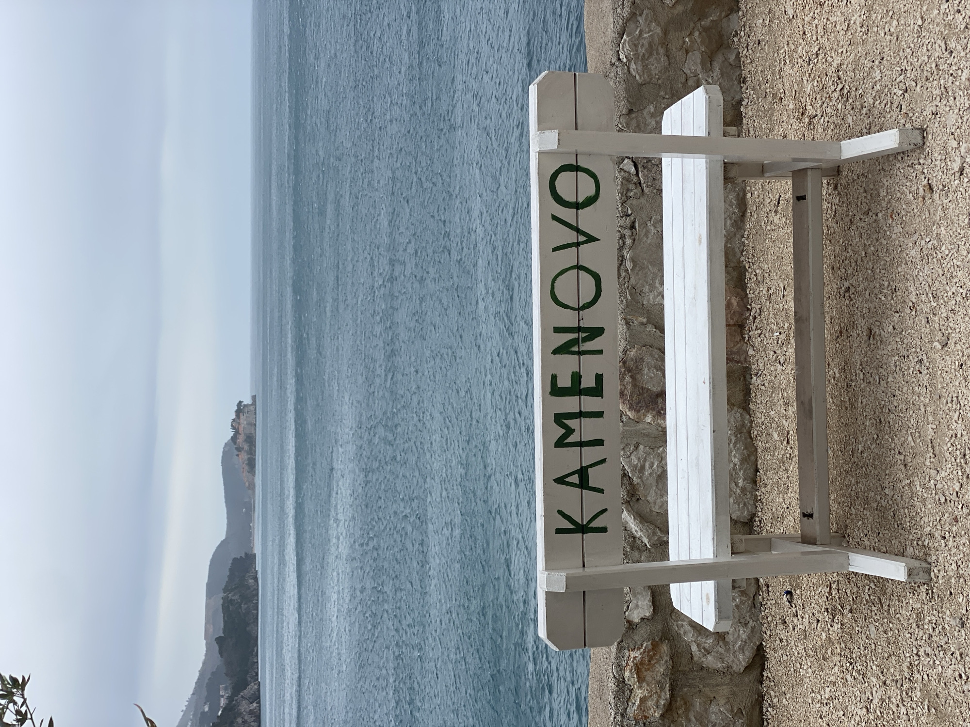 white bench with the name "KAMENOVO" painted vertically in green letters. The bench is located near a stone wall or embankment, overlooking a body of water, presumably the Adriatic Sea. In the background, there are distant mountains or hills along the coastline, suggesting the location is in a coastal region. The scene is taken in Kamenovo, Montenegro.