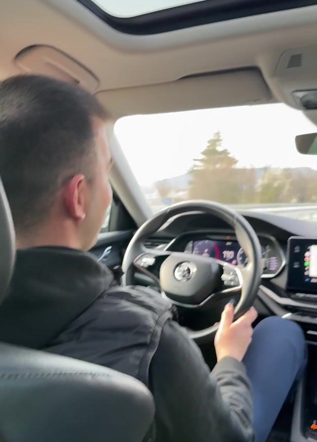 interior of a car driving on a highway. The driver, a man with short dark hair wearing a black vest and blue pants, is visible from behind. He is holding the steering wheel and looking at the road. The car has a sunroof and a digital display showing a navigation map. The car is traveling at 110 kilometers per hour. There is a passenger in the back seat of the car. The environment outside the car appears to be a sunny day.
