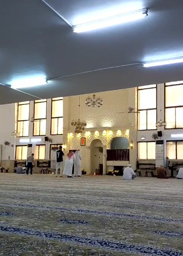 interior of a mosque. The floor is covered with a large, patterned carpet in shades of green, blue, and beige. Several people are present, dressed in both traditional Arab clothing and Western attire. Some individuals are standing and conversing, while others are sitting on the floor in prayer or contemplation. The walls are off-white and feature a series of large windows. A decorative arched alcove is visible on the far wall, adorned with lights and intricate geometric patterns. Chandeliers hang from the ceiling, illuminating the space along with fluorescent lights. Ceiling fans are also present.