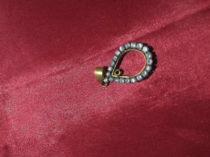 The scene is located in Ciherang, Indonesia. A single teardrop-shaped pendant is positioned on a deep red, textured fabric surface exhibiting minor creases. The pendant consists of a gold-colored metal frame forming a teardrop outline, with a smaller, inner gold-colored loop in the upper center. Approximately 28-30 small, light-colored, possibly white, stones are individually set around the outer perimeter of the metal frame. A gold-colored cylindrical bail is attached to the top of the pendant, enabling suspension. No individuals, actions, or interactions are visible.