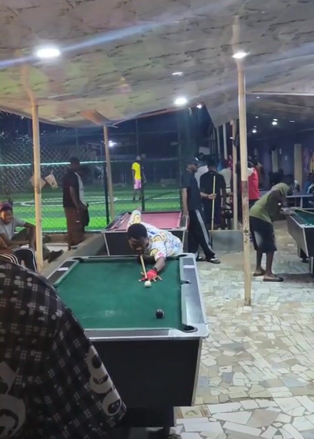 several people playing pool at an outdoor billiards hall at night. The hall is covered with a patterned tarp and lit by electric lights. Four pool tables are visible, each surrounded by people either playing or watching. Outside the hall, a few individuals can be seen on a small field enclosed by a chain link fence. The flooring is tiled with a mosaic pattern. One man wearing a colorful shirt and red gloves takes a shot, successfully pocketing the ball. The camera remains fairly still, occasionally moving slightly to follow the action.