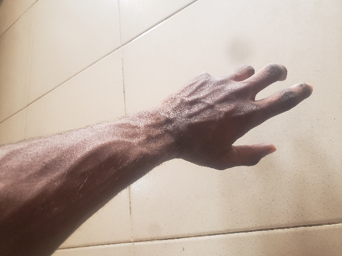 A human right arm and hand, exhibiting dark brown skin pigmentation, are depicted from an overhead perspective