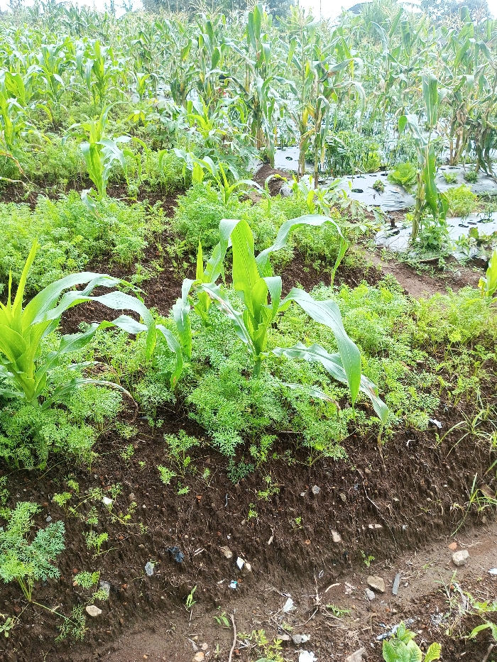 This image depicts a cultivated agricultural field in Kondha, India. The foreground and midground feature rows of dark, tilled soil supporting a dense growth of young, light-green plants with finely divided leaves, consistent with carrots. Larger, immature corn plants with broad, bright green leaves are spaced throughout these rows. Towards the midground and background, established corn stalks with developing ears and tassels are visible. Several sections in the background utilize black plastic mulch film laid on the soil, through which other vegetable crops, including leafy greens (e.g., lettuce) and chili peppers, emerge. The lowest portion of the frame shows exposed soil containing scattered small stones and incidental plant debris. No human presence or activity is observed. The scene is illuminated by diffused natural light, indicating an overcast condition.