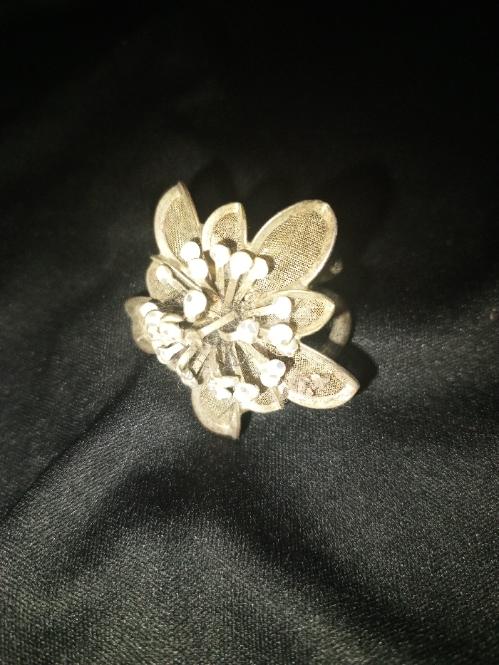 This scene, located in Tagtse Tashidingkha, Bhutan, presents a close-up, static view of a single silver-toned metallic ring. The ring is intricately designed in the form of a multi-petaled flower. Its petals are crafted from a fine, mesh-like material, and the center of the flower features a cluster of numerous small, white, spherical bead-like protrusions, resembling stamens. Visible on one of the petals is a small area of reddish-brown discoloration or tarnish. The ring is positioned on a dark, possibly black or very dark blue, textured fabric surface. Illumination appears to be focused from above, creating subtle shadows and highlighting the object against the dark background. No people, actions, or interactions are present within the frame.