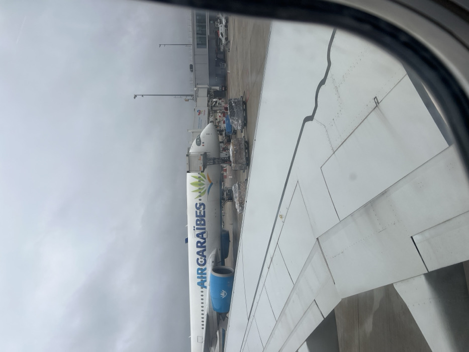 An image captured from an aircraft window provides a view of a white Air Caraïbes passenger jet parked at a gate on the tarmac at Orly Airport (ORY) in Orly, France