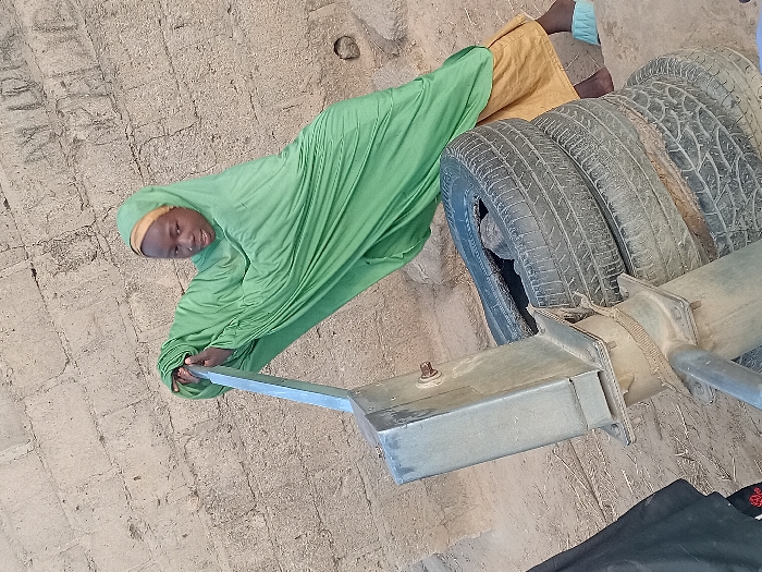 In Ayama, Nigeria, a young female operates a manual well pump. She wears a light green hijab over a mustard yellow garment, with one foot bare and the other in a light blue slipper. Her hands firmly grasp the silver-grey metal pump handle. The pump's base is stabilized by straps attached to a stack of three worn black car tires, with a visible rock inside the topmost tire. The immediate ground consists of dry, light brown earth. A textured wall of light brown concrete blocks or bricks forms the background, showing signs of age and minor surface markings.
