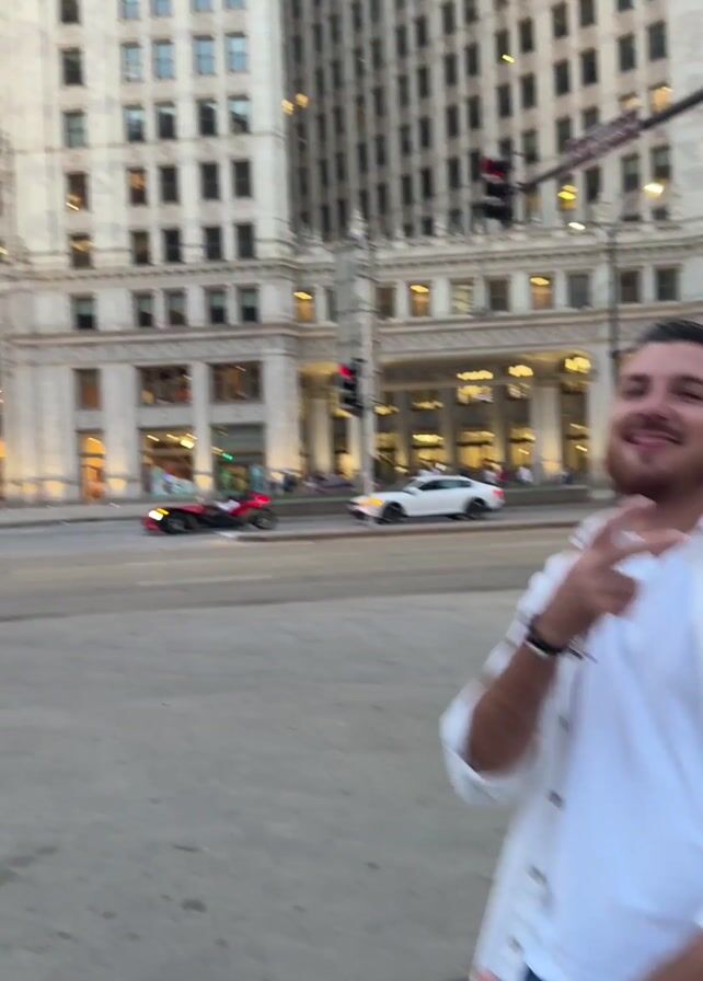 A man standing on a city sidewalk is shown from a low-angle shot. He is wearing a white button-down shirt, a white t-shirt, and distressed jeans. He appears to be clapping his hands, smiling, and moving in place. In the background, a red three-wheeled vehicle is seen driving across the street, in front of a Ghirardelli chocolate store. Buildings are visible in the background. A few people can be seen behind the parked car, and other cars are driving down the street.