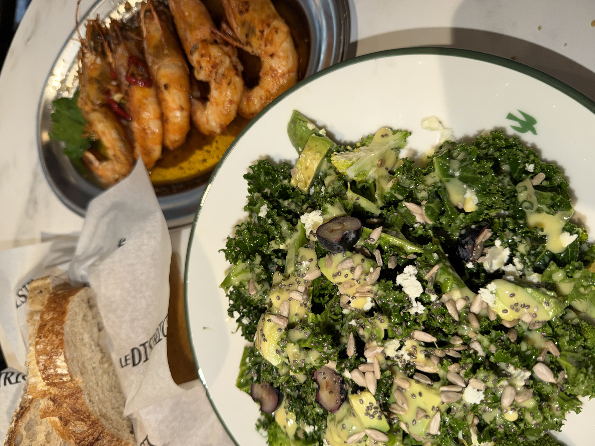 table setting with three food items. On the left is a dish of large, grilled shrimp with a dark reddish seasoning and an oily base. To the right, a white bowl with a green rim contains a salad of kale, avocado, blueberries, sunflower seeds, and feta cheese, dressed with a light-colored dressing. At the lower left is a basket lined with tissue paper holding slices of bread. The environment suggests a restaurant setting. The text on the tissue paper indicates "LE DITRI," potentially a brand or location. This image was likely taken in Tirana, Albania.