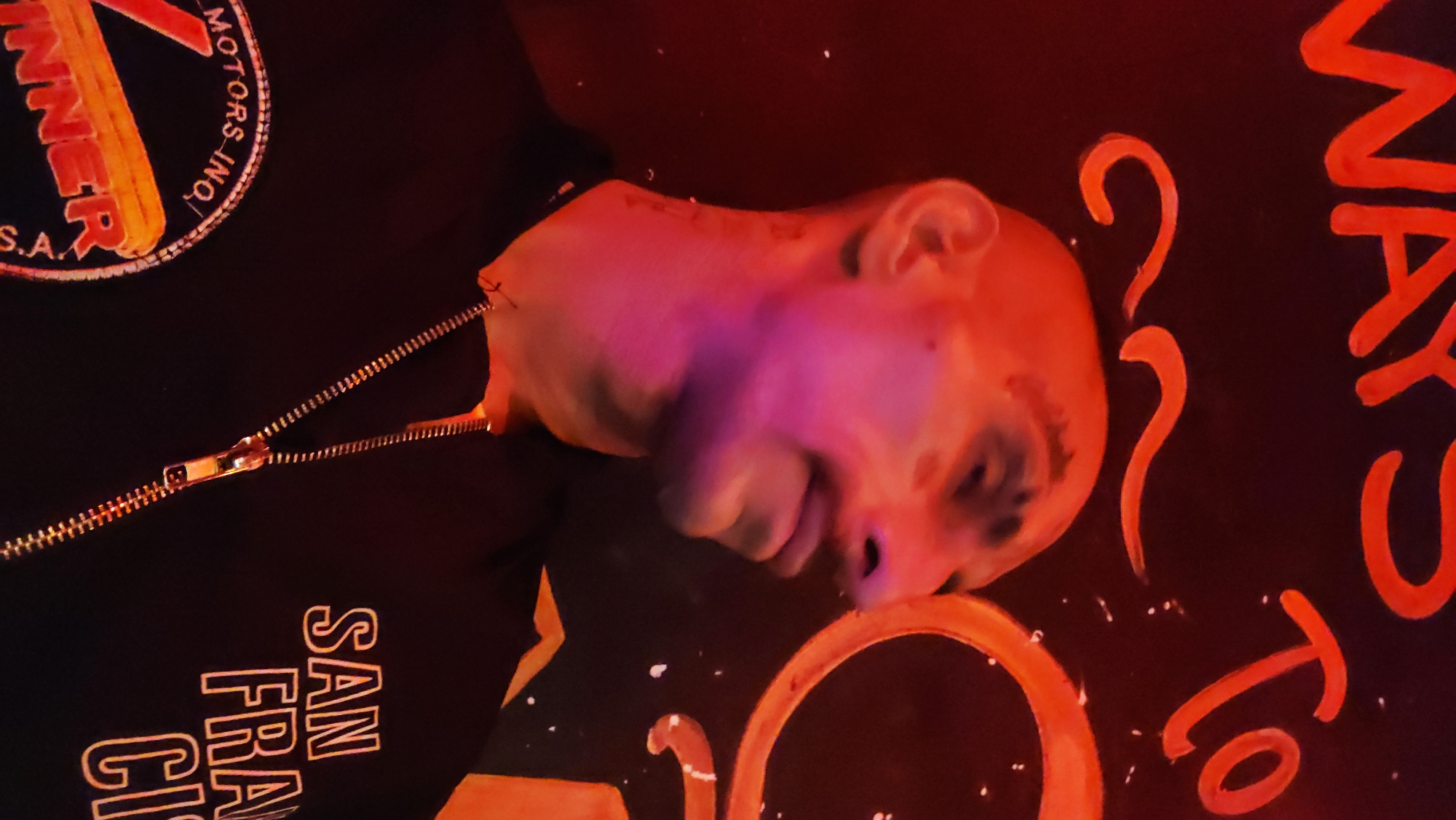 person lying on a dark surface, with red and purple lighting illuminating their face. The person is wearing a black jacket with a gold zipper and a logo on the chest that includes the words "INNER MOTORS INC." and "SAN FRA CI." Red neon-like text is partially visible on the surface beside the person. The location is not discernible from the image.