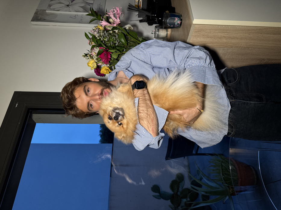 This image depicts an indoor scene in Chambœuf, France, featuring an adult male holding a small, fluffy, light brown Pomeranian-type dog. The male, with light brown hair and a short beard, is wearing a light blue and white striped button-down shirt with rolled-up sleeves, dark jeans, a black smartwatch on his left wrist, and a gold bracelet on his right wrist. A small red tattoo is visible on his right forearm. Both the man and the dog are looking directly towards the camera; the dog's head is tilted slightly to its left. To the right of the male, a light-colored wooden counter displays a bouquet of assorted cut flowers, primarily yellow, pink, red, and white, in a clear vase. Adjacent to the flowers are a clear glass cloche over a small object, a dark diffuser bottle with reeds, and a dark candle in a decorative glass holder. Above the counter, a large framed artwork with a muted floral design hangs on a light-colored wall. To the left of the male, a large glass door or window reveals an outdoor patio area under a dark blue sky, indicating evening or night conditions. Visible through the glass are various potted plants, including a large opuntia cactus and an aloe plant in a terracotta pot, a dark-colored outdoor chair, and part of a round glass table. Reflections on the glass suggest an interior light source.