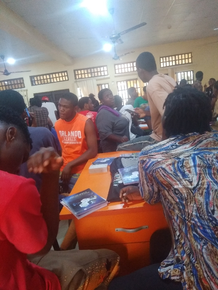 This image depicts an indoor gathering of approximately twenty individuals, predominantly young adults, within a facility located in Ihiagwa, Nigeria