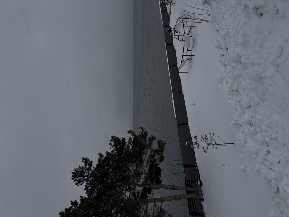 This image presents a winter scene in Tsamakaberd, Armenia, overlooking a large body of water, likely Lake Sevan, under an overcast grey sky. The water is dark and choppy with ripples, and small dark specks are visible on its surface in the distance. The foreground and midground are entirely covered in white snow, with significant piles of snow accumulated in the immediate foreground. Multiple distinct footprints are visible in the snow in the middle-left. A small coniferous sapling stands upright in the center-left of the snow-covered area. On the right, a white curved metal outdoor lounge structure with white fabric seating is situated on the snow, accompanied by a smaller white chair or table. Several bare deciduous shrubs are visible near these objects. A dark-colored horizontal deck or walkway extends across the midground, bordering the water. It is lined with evenly spaced black posts featuring light-colored caps. A dark wooden bench is positioned on the deck on the left side. A light blue-green metal structure, consistent with a ladder or steps, extends into the water from the deck on the left. Two tall, mature coniferous trees, identified as pines, stand on the far left of the image, their branches partially covered with snow. No individuals are present in the scene.