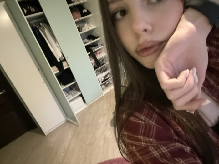 A forensic examination of the image depicts an indoor scene, likely a residence in Kudrovo, Russia. The central foreground features a female subject, visible from the mid-chest upwards, with long dark hair. Her right eye is directed towards the viewer, and her lips, with a brownish-pink lipstick, are slightly parted. She is clad in a reddish-brown plaid shirt with a light-colored grid pattern, partially open to reveal a dark garment underneath. Her left hand, featuring white manicured fingernails, lightly grasps the wrist of a male hand. This male hand is positioned against the female's lower face, specifically the chin/jawline area, and exhibits a dark smartwatch on the wrist. In the background, a multi-section wardrobe or closet system is visible. The left portion consists of a dark brown door and a light-colored sliding door. The right portion features light green sliding doors, one of which is partially open, revealing interior shelving units containing folded clothes, accessories, and storage baskets. The floor is composed of light-colored wooden planks. A small section of a pink, textured textile is present in the lower right foreground.