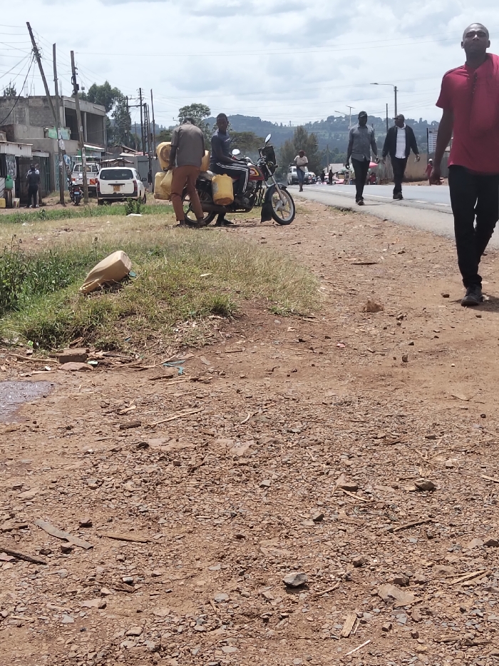 Two people with a motorcycle are on the side of a rural road. The motorcycle is carrying multiple yellow water jugs. Several other people are walking along the road. A white pickup truck and other vehicles are in the distance. The foreground is a dirt and rock area. In the background, there are hills. The sky is cloudy. There are telephone poles alongside the road and buildings on the left.