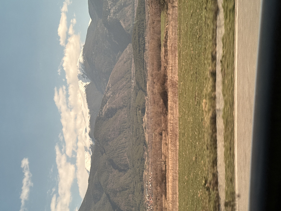The image depicts a wide-angle landscape view of the area surrounding Dupnica, Bulgaria, captured from a low vantage point, likely from a vehicle in motion. The upper quarter of the frame features a pale blue sky with several scattered, white cumulus clouds. Below the sky, a prominent mountain range extends horizontally across the background. The highest peaks of these mountains are distinctly covered in white snow, while the lower slopes are densely forested with dark green coniferous trees. In the mid-ground, below the tree line, a band of light brown, mostly bare deciduous trees and shrubbery is visible, interspersed with patches of lighter ground. To the left-center of the mid-ground, a small settlement or section of the city of Dupnica is visible, characterized by clusters of buildings with reddish-brown tiled roofs situated at the foothills. The immediate foreground consists of a flat expanse of green grass, indicative of fields or pastureland, extending across the width of the frame. Below this green area, a horizontal light gray concrete barrier or curb is present. The very bottom edge of the image is occupied by a blurred, dark gray horizontal band, consistent with the interior frame or dashboard of a vehicle from which the photograph was taken. The scene is illuminated by natural daylight, casting subtle shadows. No individuals or specific human activities are depicted.