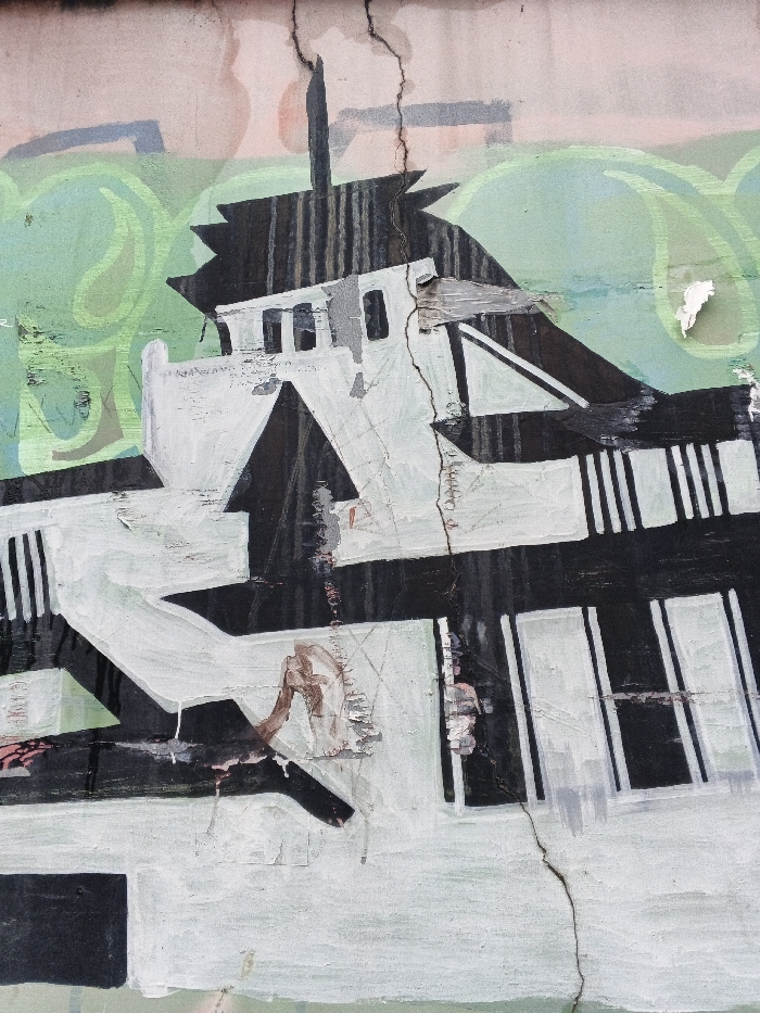 This is a close-up of painted graffiti on a cracked wall. Predominantly black and white, the graffiti features a boat-like structure with a chimney. The drawing is abstract with rectangular and triangular shapes representing parts of the boat. Patches of peeling paint and a significant crack running vertically through the image show wear and age. Green and faded pink paint appear in the background.