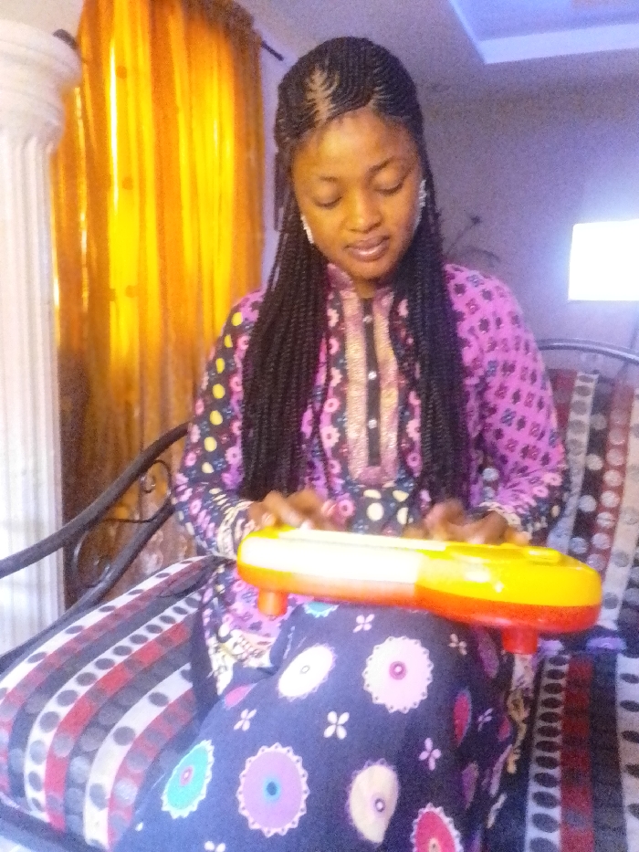 A female individual is seated indoors, focusing on a yellow and orange/red toy musical instrument resting on her lap