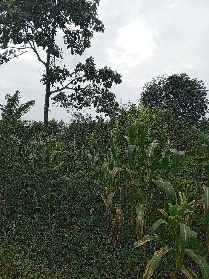 The image depicts a lush rural scene featuring a field of corn stalks in varying stages of growth. Several tall trees with broad leaves tower over the crops, their branches reaching into a cloudy sky. Mixed among the corn are other plants, possibly cassava, adding to the dense vegetation. The overall impression is one of abundant, natural growth within an agricultural setting.