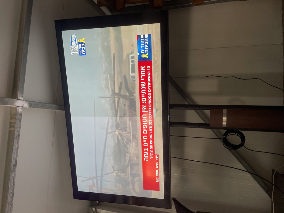 The image depicts an indoor scene within the Hevel Eilot Regional Council, Israel, featuring a large, dark-framed flat-screen television displaying a live news broadcast. The television is positioned on a dark vertical stand, which includes a section with a wooden finish and a silver metallic strip. Black cables are visibly coiled around the stand and run vertically down the adjacent wall. The television screen shows a background image of multiple military helicopters, possibly tilt-rotor aircraft, situated on a dusty or unpaved outdoor surface. A white van is partially visible behind the helicopters. Overlaying this image are several Hebrew text elements and graphics: * A prominent red banner across the bottom reads, "אחרי שעות ארוכות: אין חטופים חיים בעזה" (After long hours: No living hostages in Gaza). * Below this, smaller text states, "13 המשוחררים הנוספים בדרך לנקודת המפגש עם צה"ל" (The 13 additional released [individuals] are on their way to the meeting point with the IDF). * In the bottom-left corner, the "N12" channel logo is displayed, along with "שידור חי" (Live broadcast) and "רע" (possibly referring to Re'im, a kibbutz in southern Israel). * The top-right corner features the Channel 12 logo alongside an Israeli flag and the text "סוף סוף בבית" (Finally home), accompanied by a yellow ribbon symbol. * On the right side of the screen, above the red banner, a blue box contains the text "חוזרים הביתה" (Returning home), also accompanied by a yellow ribbon symbol. A subtle vertical line, lighter than its surroundings, is visible running down the central-left portion of the television screen. The immediate environment consists of light-colored, vertically paneled walls, possibly corrugated metal or finished drywall. The ceiling, visible at the top, comprises light-colored panels supported by exposed metallic beams or joists. Partial views of a dark, indistinct object on the far left and a wooden structure on the far right are also present.
