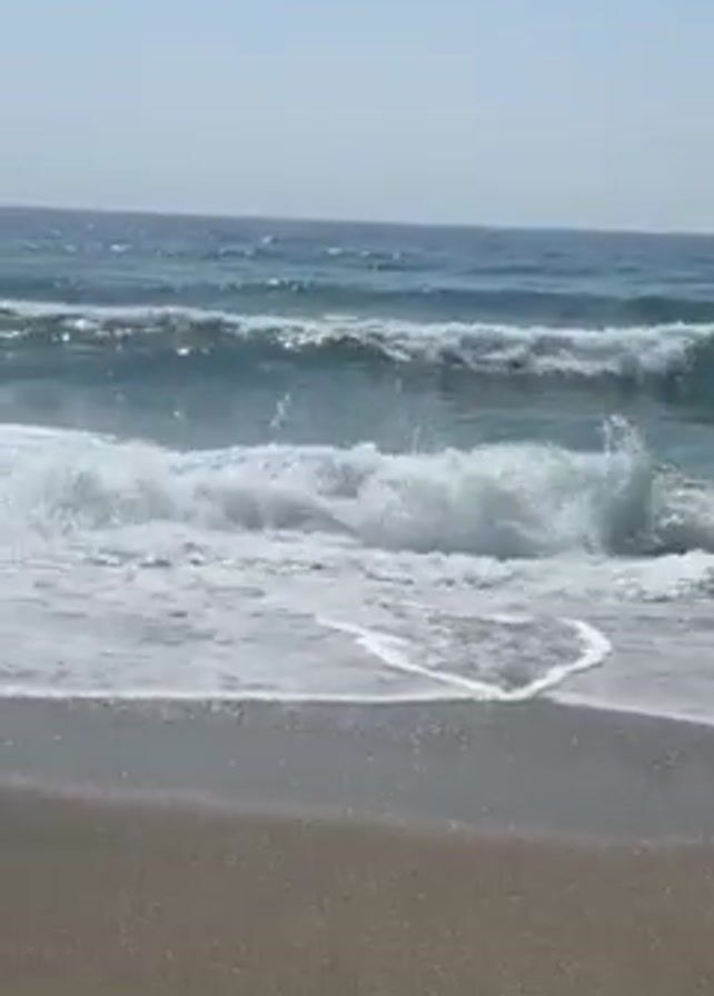 beach with waves rolling in. The sand is gray-brown, and the water is a mix of blue and green. There is a ship in the distance. The sky is clear and blue.