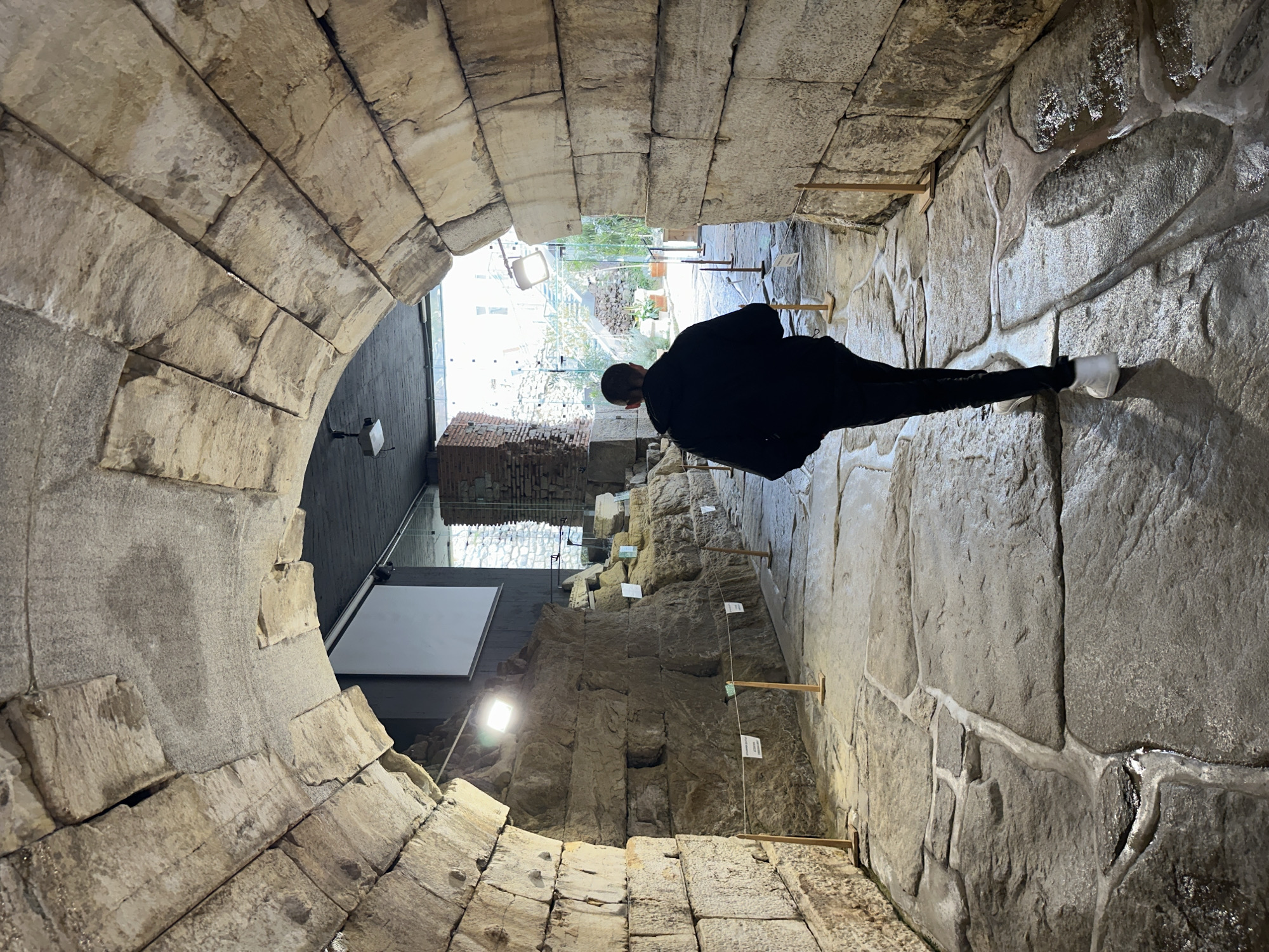 The scene is set within a stone-arched underpass leading to the Roman Stadium of Philippopolis, located in Plovdiv, Bulgaria. A single individual, seen from behind, walks forward through the center of the archway. The person is dressed in a dark hooded jacket, dark trousers, and white athletic shoes. The passage itself is constructed from large, irregularly shaped, light-colored stone blocks forming a vaulted ceiling and thick side walls. The stone blocks show signs of age, texture, and some moisture. The floor is paved with large, uneven stone slabs, with visible standing water or dampness in crevices and depressions. To the left of the walking path, a section of excavated ancient stone walls is visible, illuminated by a bright, square LED floodlight mounted on a stone support. This excavated area is separated from the pathway by a simple rope barrier strung between short wooden posts, with small white informational signs attached. Beyond the archway, the passage opens into a wider area. A dark, modern ceiling is visible overhead, from which a projector is suspended. A large, rectangular white projection screen is mounted on a dark wall to the left. Further ahead and to the right, daylight illuminates an outdoor section visible through glass panels or an open area, revealing greenery, potted plants, and distant architectural elements. The immediate environment merges ancient stone ruins with modern exhibition infrastructure.