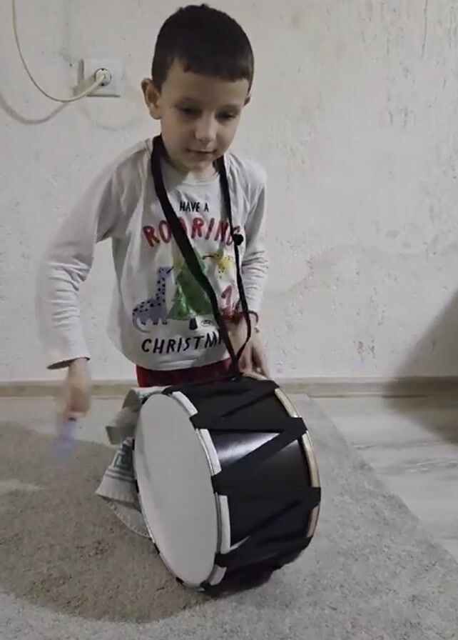 A young boy is playing a black and white drum