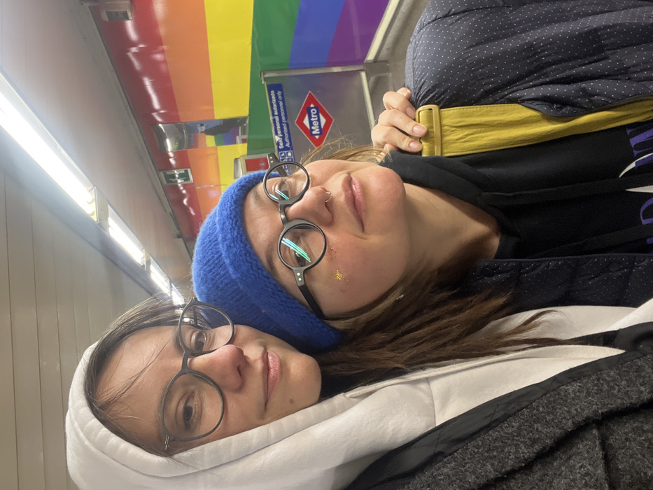 Two people pose in front of a rainbow-colored wall, presumably in a metro station, as seen by the "Metro" sign. The person on the left wears glasses and a white hoodie, while the person on the right has a blue beanie and round glasses, with what appears to be glitter on their face.