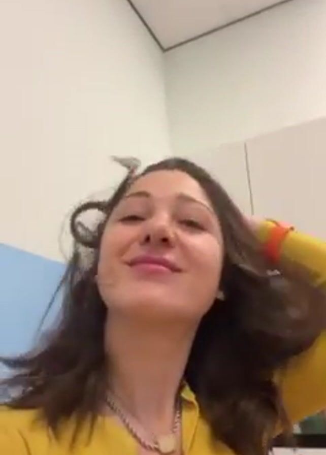 A woman with medium-length brown hair, wearing a yellow cardigan and a silver necklace, smiles while running her hand through her hair. She is indoors, with a white ceiling and a blue wall visible in the background.