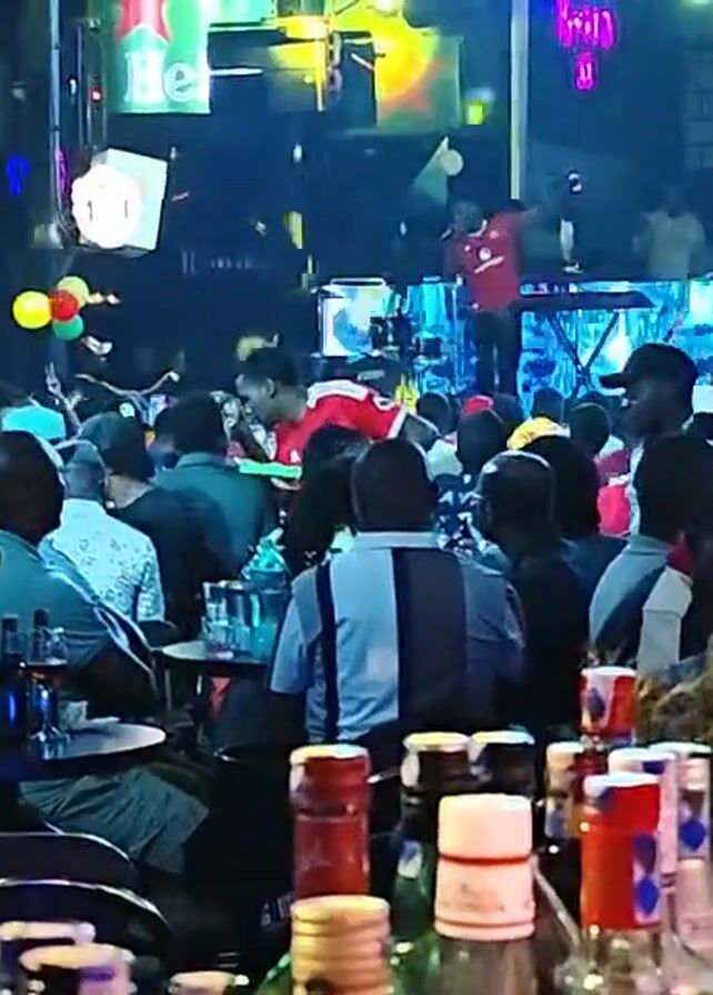 The video captures an indoor scene, possibly a crowded bar or club with a live band performing on stage. The audience, predominantly black men, is seen sitting at tables, some holding drinks and others engaging in conversation. The lighting is vibrant with neon colors, and there are decorations like balloons. A prominent Heineken sign is visible in the background, adding to the ambiance of the place. The scene overall suggests a lively and social gathering with entertainment.