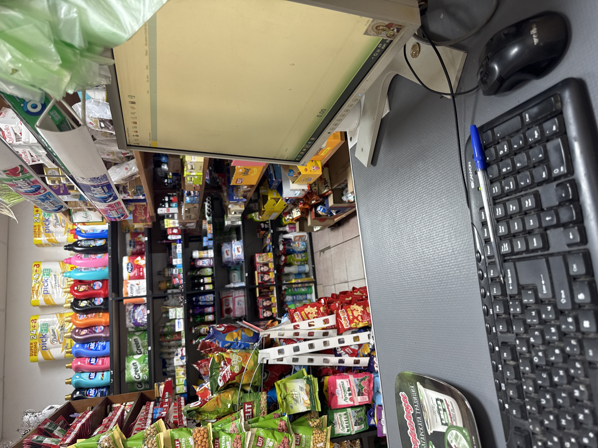 cluttered cashier's station in what appears to be a small grocery store. The cashier's workstation includes a monitor, keyboard, mouse, and a pen. Shelves of groceries, including snacks, cleaning supplies, and other household items, are visible in the background. OCR suggests a location in Bulgaria, specifically Atiya, based on the presence of Bulgarian text and the phrase "БЛГАРСКАТА ТРАДИЦИЯ". The image provides no specific information regarding people or interactions.