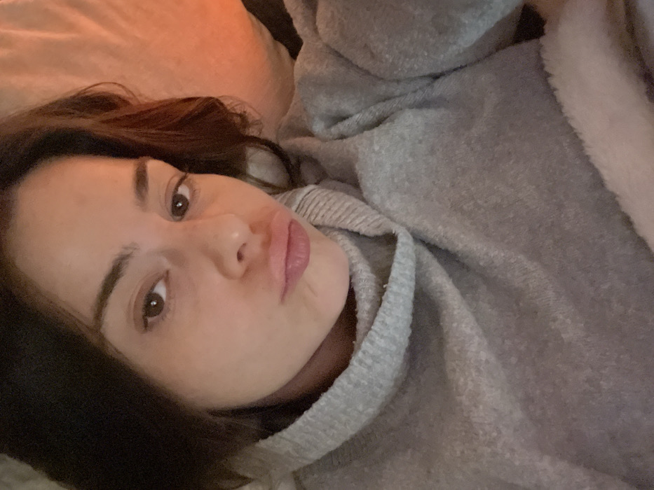 A young woman with brown hair and light skin is lying down, looking at the camera with a slight pout