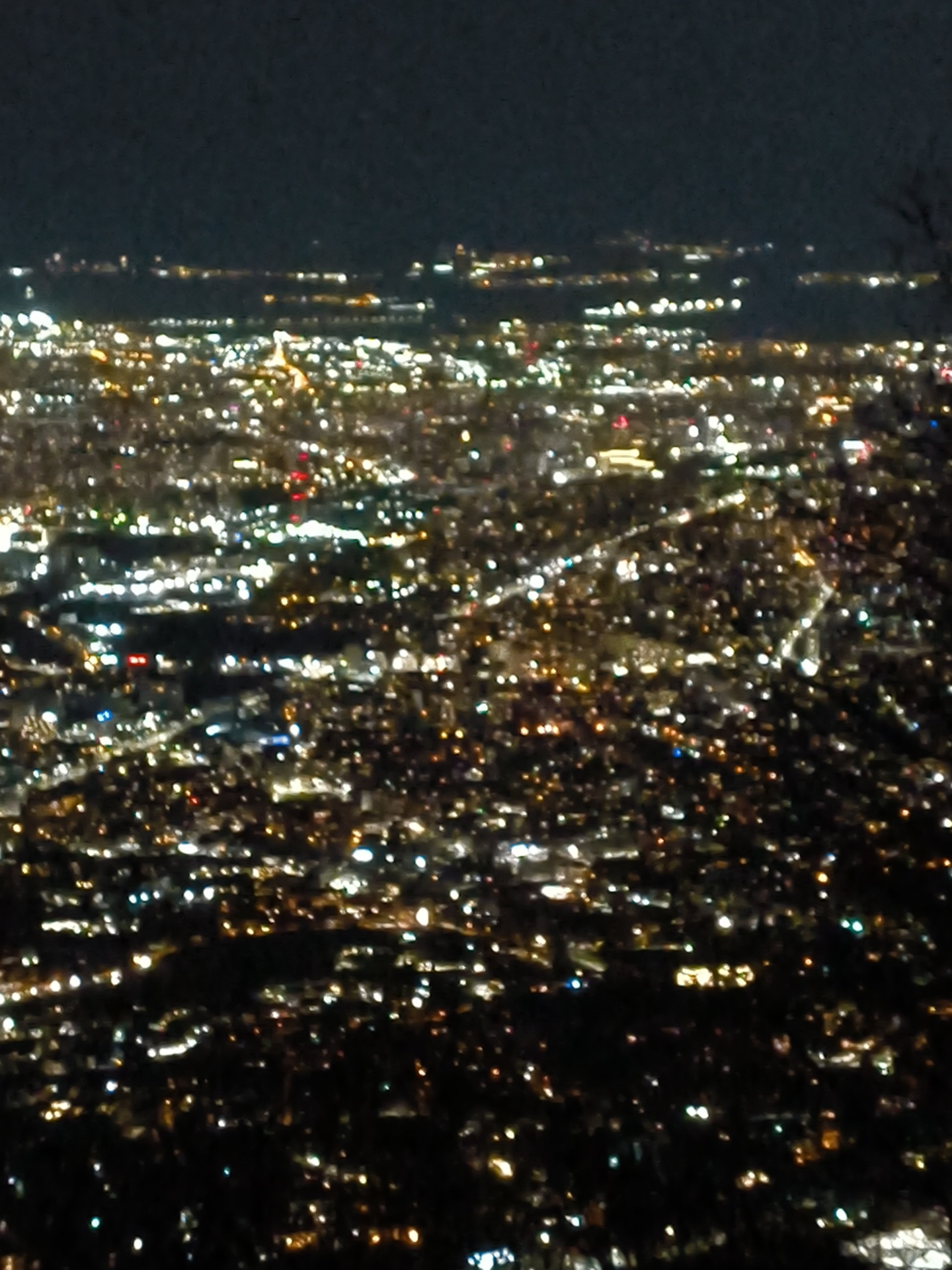 The image depicts a nighttime view of Sofia, Bulgaria from a high vantage point. The city is illuminated with numerous artificial lights, creating a bright glow across the landscape. In the distance, faint lights from another part of the city can be observed. The foreground is dark, suggesting the presence of elevated terrain or vegetation.