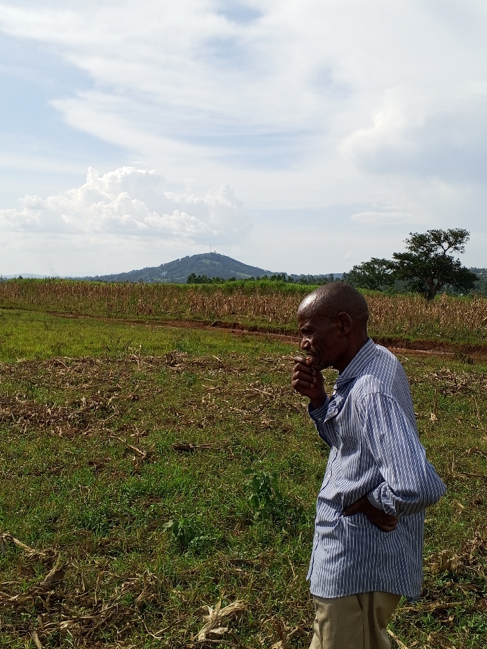 The scene depicts an outdoor agricultural landscape in Keyian ward, Kenya, under a partly cloudy sky. An adult male, appearing elderly, with dark skin and a shaved head, is positioned in the right foreground, seen in a ¾ profile facing left. He is wearing a blue and white striped long-sleeved button-up shirt and light brown trousers, with his left hand in his pants pocket and his right hand raised to his mouth. The immediate environment consists of a field with green ground cover and scattered dried corn stalks or stubble. A dirt path or track is visible running horizontally through the midground. In the background, a prominent, tree-covered hill with a visible communication tower on its summit rises against the horizon. Several other trees are present further right in the background. The sky features numerous white cumulus clouds against a lighter blue.