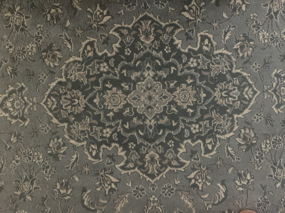 The image displays a close-up shot of an intricately patterned rug