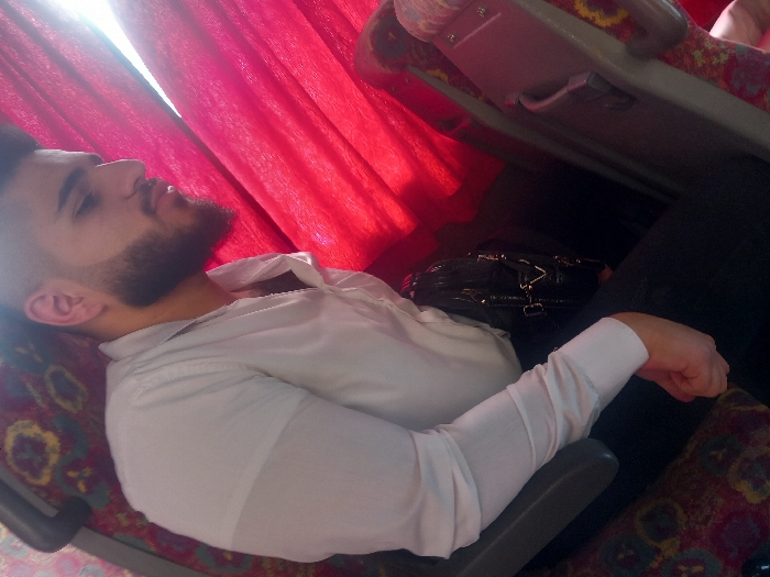 The image displays the interior of a passenger vehicle, likely a bus, in the city of At-Tall, Syria. A young adult male is depicted in profile, seated and resting with his eyes closed. He has short, dark hair with faded sides and a dark, trimmed beard and mustache. He is wearing a white long-sleeved collared shirt. He sits in a seat with multi-colored (red, yellow, blue, green) patterned upholstery. Adjacent to him, a black handbag with gold-colored hardware is visible. Red curtains, partially drawn, are seen behind him, with bright natural light entering from a window beyond. A gray seat armrest and a portion of another patterned seat back with a gray handle are also visible.