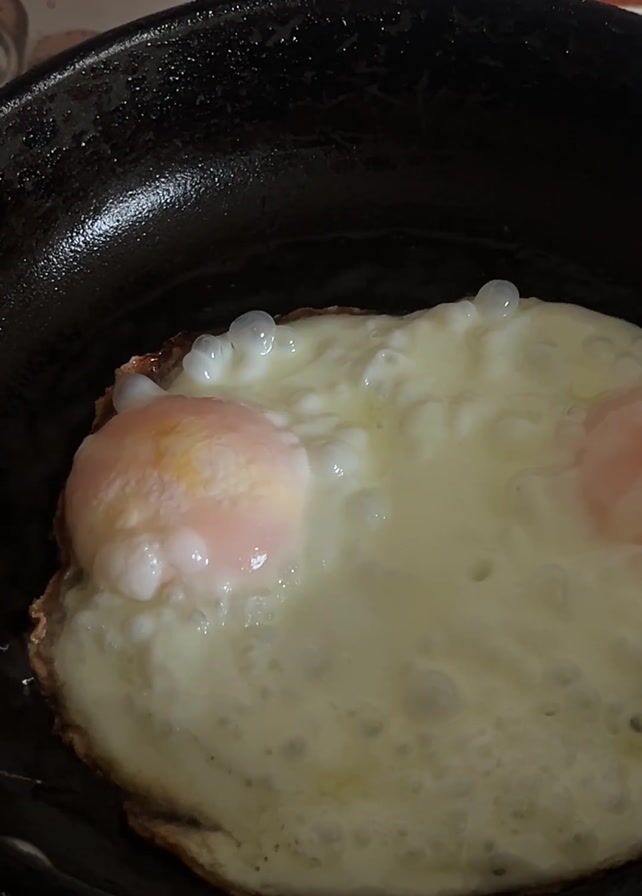 two eggs frying in a black pan