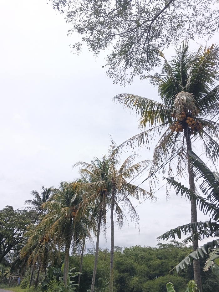 A row of coconut trees line a road with dense green vegetation in the background under an overcast sky. Coconuts are visible on some of the trees. Another, taller tree with a broad canopy is visible in the upper portion of the image. Power lines run through the scene, intersecting the palm fronds. Banana leaves also add to the diverse plant life on the roadside.