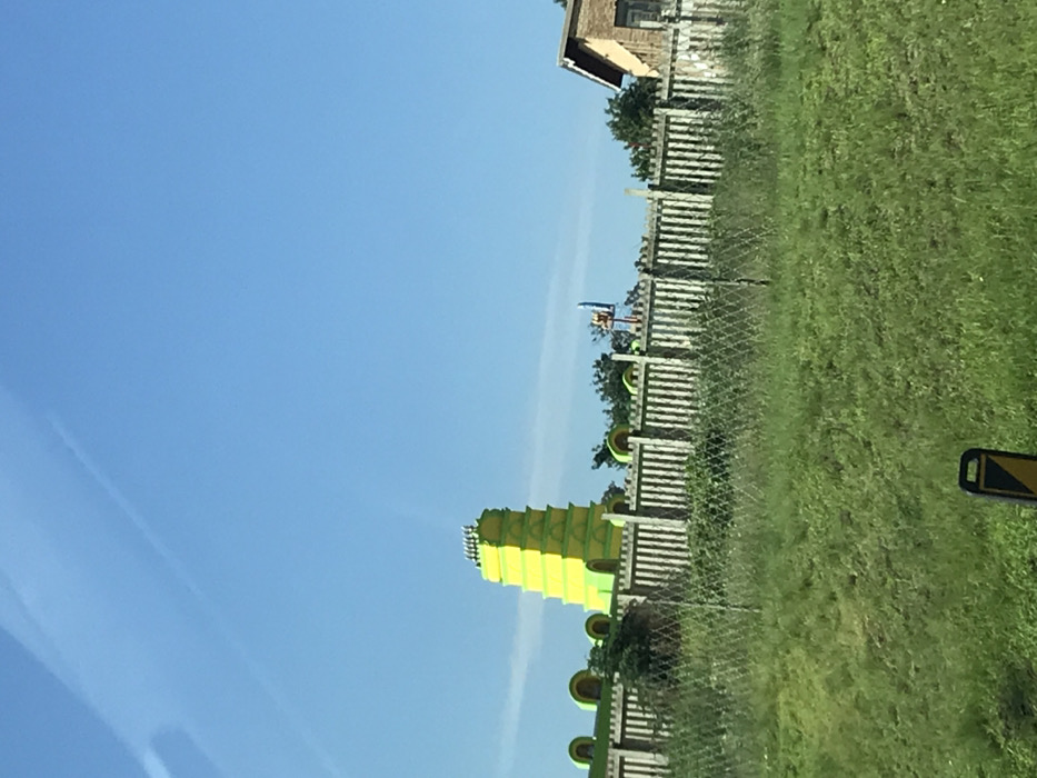 A yellow water slide tower stands beside a wooden fence line bordering green grass under a clear blue sky. Behind the fence is a small building and a playground structure. A section of the photograph is blurry, making it difficult to discern specific details. The overall scene suggests an amusement park or recreational area.
