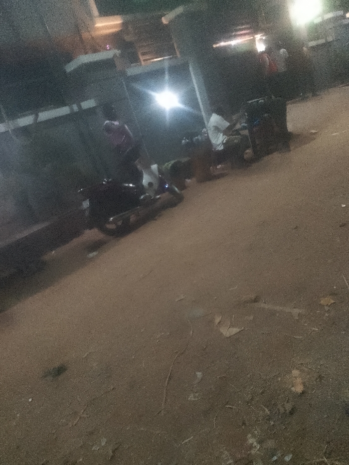 People gather on a poorly lit street at night. A parked motorcycle is visible near a person standing with a dark shirt. Another individual is sitting further back, perhaps at a table. Streetlights provide stark illumination, casting shadows across the ground, which appears to be dirt or gravel.