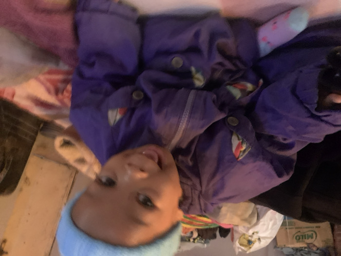 A baby in a blue beanie and purple jacket smiles at the camera. The child is lying down on what appears to be a bed with various blankets and pillows. The background is cluttered, with clothing items and a box labeled "MILO" visible. The overall image has a homey and candid feel.